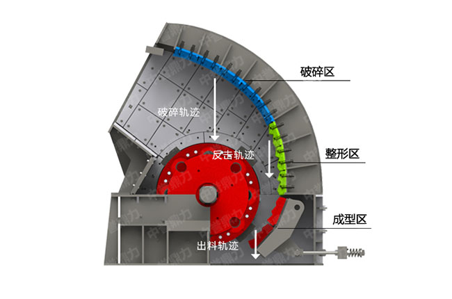 通過電動機(jī)帶動轉(zhuǎn)子的高速旋轉(zhuǎn),由于轉(zhuǎn)子的高速旋轉(zhuǎn),當(dāng)物料進(jìn)入板錘作業(yè)區(qū)時,受到錘頭的沖擊、碰撞、剪切等作用而破碎,已破碎的石料被拋到反擊裝置上得到再次破碎,之后被彈回板錘作用區(qū)重新破碎,石料經(jīng)過多次反復(fù)破碎直至合格被排出。