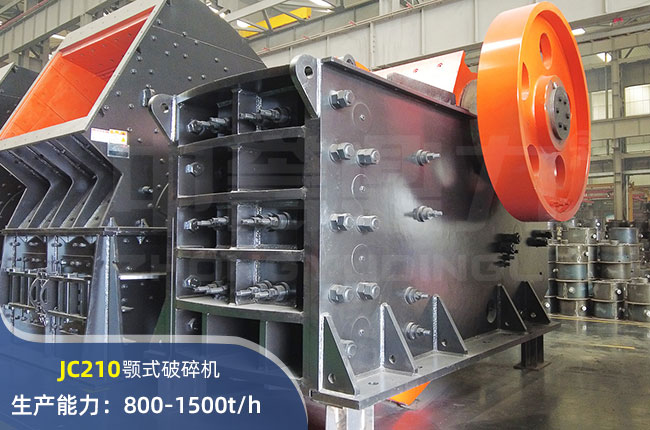 JC210顎式破碎機進料口尺寸2100×1600mm,進料粒度≤1360mm,出料大小≤175mm,電機功率450kw,時產量在1500噸左右。