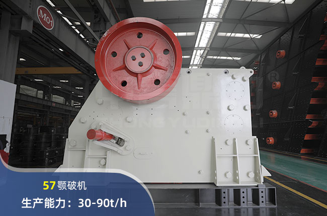 57鄂破一小時產量30-90噸,進料口尺寸500×750mm,適合破碎粒度≤425mm物料,排料口調整范圍在50-120mm范圍可調節(jié)。