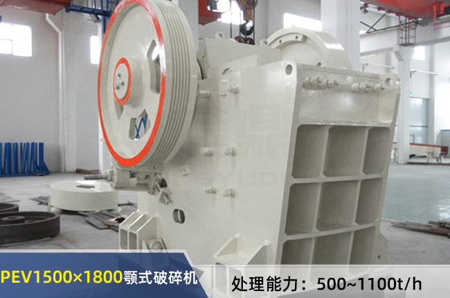 1518破碎機指PEV1500×1800顎式破碎機,屬于PEV鄂破中較大的一個型號,設(shè)計的進(jìn)料口能進(jìn)不大于1250mm的物料,破碎后的石料大小在210-360mm之間可調(diào)整,每小時處理能力在500-1100噸,配的電機功率是280千瓦,其外形尺寸(長x寬x高)7460x6240x4250mm,重量約122噸。