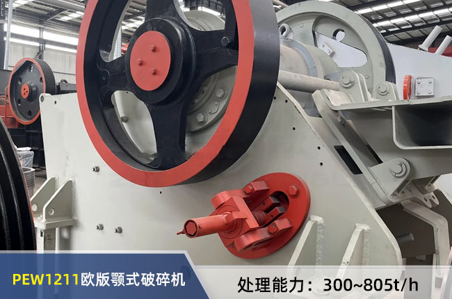 PEW1211歐版顎式破碎機一個小時處理能力300-805噸,電機功率是160kw,1200×1100mm的大進料口可以直接破碎粒度≤990mm的物料,排料口調整范圍125-275mm,外型尺寸為3996×2347×3508mm。