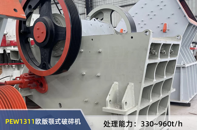 PEW1311歐版顎式破碎機(jī)進(jìn)料口尺寸為1300×1130mm,進(jìn)料粒度不能超過1070mm,處理能力為330-960t/h,出料調(diào)整范圍125-300mm。