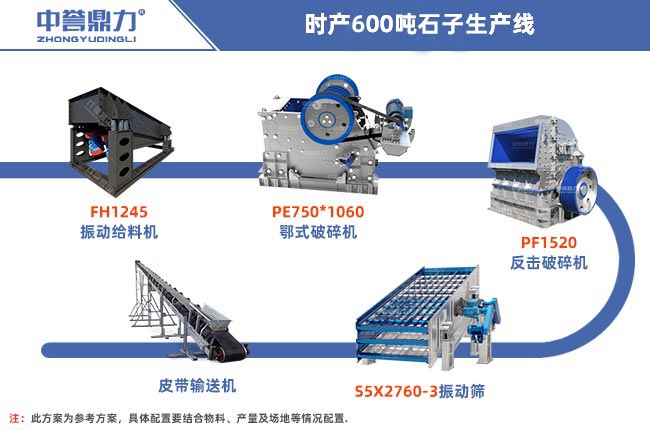 時產600噸碎石子生產線的投資大概需要在五六百萬左右,如果選用重型錘式破碎機做主要破碎設備,可一次破碎成型,加工工藝比較簡單、投資會少一些。