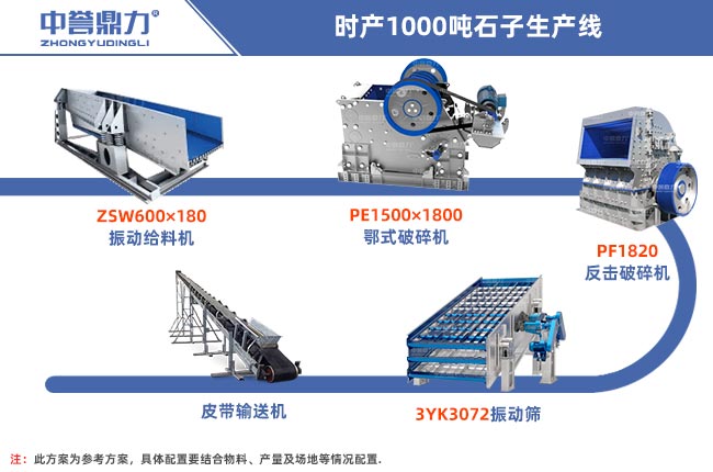 時產1000噸碎石生產線的配置方案由給料設備、一破設備、二破設備、篩分設備以及輸送設備組成,具體設備配置由ZSW600×180振動給料機、PE1500×1800顎式破碎機、PF1820反擊式破碎機、3YK3072振動篩、輸送機。詳細配置單如下: