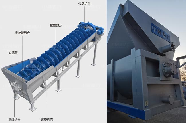 絞龍洗沙機水里那頭無傳動組,屬于螺旋洗砂機的尾部,尾部軸承外置于水槽外,避免臟水污染軸承。整機傳動組合在高處,通過電機和減速器帶動軸承旋轉,葉輪翻轉。