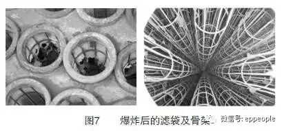 隨著袋式除塵器的普及,袋式除塵器粉塵爆炸事故也呈上升趨勢(shì)。如上海某鋼廠的干熄焦除塵系統(tǒng),由于前部阻火墻制造的問(wèn)題,造成火星進(jìn)入除塵器內(nèi)從而引起爆炸,將除塵器進(jìn)口管道盲板炸出幾十米遠(yuǎn),除塵器箱體嚴(yán)重變形。又如沈陽(yáng)某機(jī)制炭廠,由于鋸末在炭化過(guò)程中產(chǎn)生大量的焦油和碳?xì)浠衔锏纫兹肌⒁妆镔|(zhì),而且焦油粘在濾袋上隨著時(shí)間推移越積越多,當(dāng)有火星進(jìn)入除塵器后就引起了除塵器爆炸。除塵器爆炸瞬間所產(chǎn)生的能量可使花板嚴(yán)重變形,濾袋爆裂情況見(jiàn)圖7。