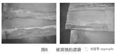 腐蝕損壞的痕跡多為放射狀,并在濾袋表面形成大面積變色,造成濾袋變硬、變脆并出現(xiàn)少量不規(guī)則圓周洞,但與火星燒穿濾袋產(chǎn)生的不規(guī)則圓周洞不同,是可用肉眼分辨出來(lái)的。圖8為河南某氧化鎂廠氯化工段的煙氣中的HCl含量高,PTFE濾袋平均使用壽命不到3個(gè)月,就被腐蝕得千瘡百孔無(wú)法繼續(xù)使用。所以,如果在此條件下進(jìn)行脈沖清洗濾袋,將會(huì)加速濾袋的損壞。