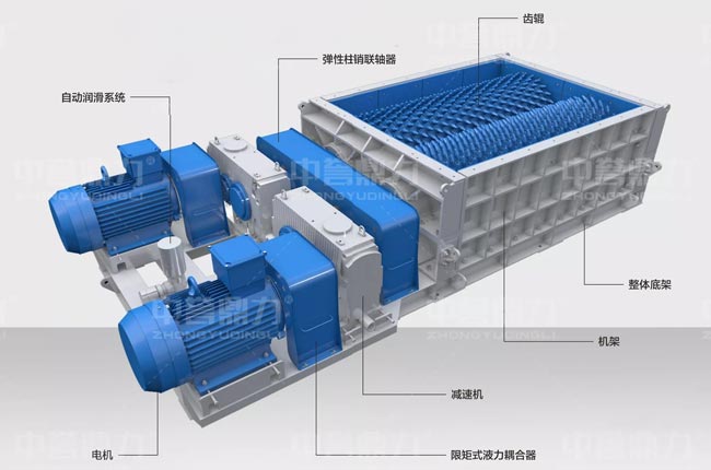 中譽鼎力雙齒輥式破碎機組成部分包括電機、自動潤滑系統、彈性柱銷聯軸器、齒輥、整體底架、機架、減速機、限矩式液力耦合器組成。