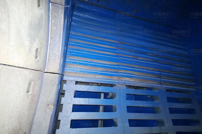 襯板、篦板加厚,增加耐磨性。主、側襯板的固定采用六角頭高強螺栓,螺栓頭部藏于襯板內,防止螺栓磨損,襯板脫落。