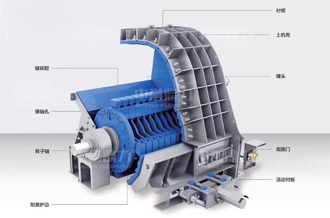 大型錘式破碎機由機殼、轉子、反擊板、錘頭、支架、襯板等組成。