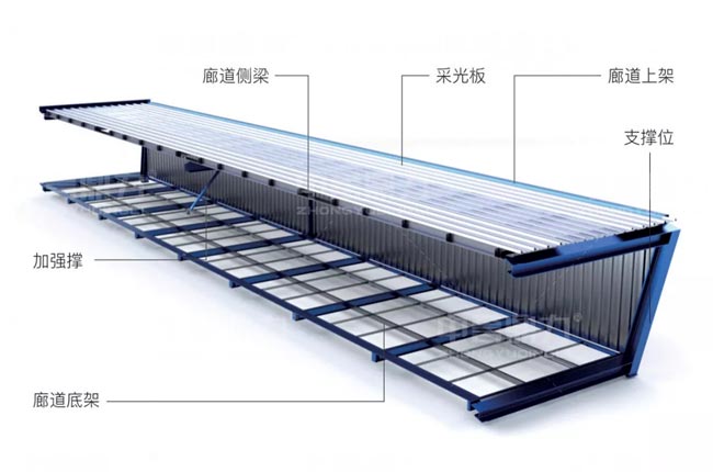 中譽鼎力DL組裝式廊道(砂石運輸廊道),組成部分包括廊道底架、加強撐、波紋側板、底部花紋板、廊道側梁、采光板、廊道上架、支撐位等組成。廊道內還設置有電纜、照明裝置、監控攝像頭固定位置。