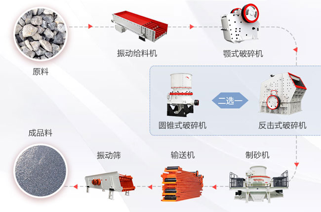 配置機械:喂料機+顎破機(初級破碎)+圓錐石子機(二破)+篩機+帶式輸送機+中轉料堆(大產量加工時配置)