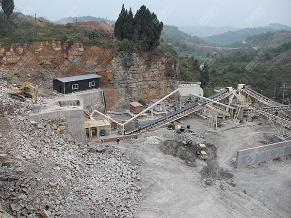 破碎生產線中大塊巖石經料堆由振動送料機均勻地送進鄂式碎石機進行粗碎,粗碎后的巖石由皮帶運輸機送入反擊礦山碎石機進行深度破碎;整型破碎后的巖石由皮帶運輸機送進振動篩進行篩選分級,篩選分級出多種不同性能的石子,粒度合格的石子由成品皮帶運輸機送往砂石堆;不粒度合格的石子由皮帶運輸機返料送入反擊礦山碎石機進行又一次破碎,形成閉路多次循環,成品粒度可根據用戶的需要進行組合和分級,為保護環境,可搭配輔助的除塵機械。