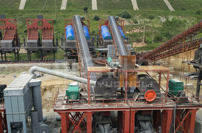 2、中高硬度物料:顎式破碎機(jī)+硬巖破碎機(jī)+配套設(shè)備