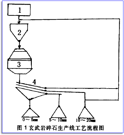 玄武巖碎石生產(chǎn)線的技術(shù)規(guī)程,依據(jù)市場所形地貌以及生產(chǎn)技術(shù)而定,如圖1。