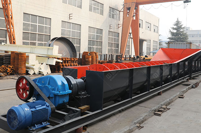 螺旋洗砂機設備的驅動部刺激螺旋軸以需速度旋轉,在水流的作用下,石粉不停翻滾而且性卸料口運動,雜料隨溢流水經溢流堰排出,成品從卸料口排出,符合清洗、分級、除雜,螺旋軸對比長,整個機械相對占地空間大。