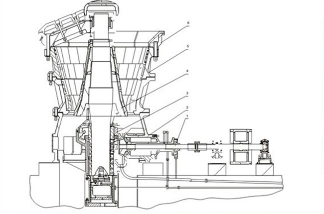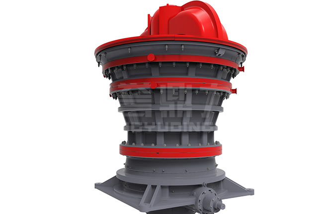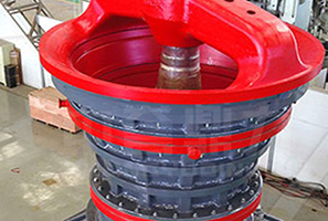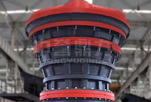 旋回式破碎機(jī)主要以機(jī)座、偏心套、轉(zhuǎn)動、破碎圓錐、中架體、橫梁、油缸等部件組成。