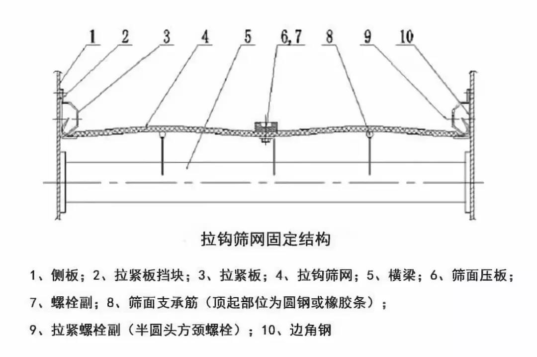 處理方法:對振動篩篩面支撐筋進行改進,增加篩網中間支撐筋的數(shù)量(由3根增加到5根),并且每根都與中間那根一致,具備安裝固定螺栓功能,通過多塊壓板壓緊,篩網固定,無法達到共振。