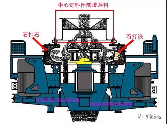 PCL制砂機單一的進料方式決定了它的易損件壽命較短,而VSI不同: