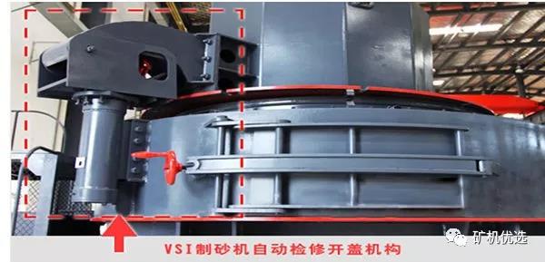 VSI4X和VSI5X制砂機均采用液壓裝置自動啟蓋,方便快捷移開上蓋,人工勞動強度,即使只有一人也可以輕松更換轉子及其配件,方便檢修,提高使用效率。